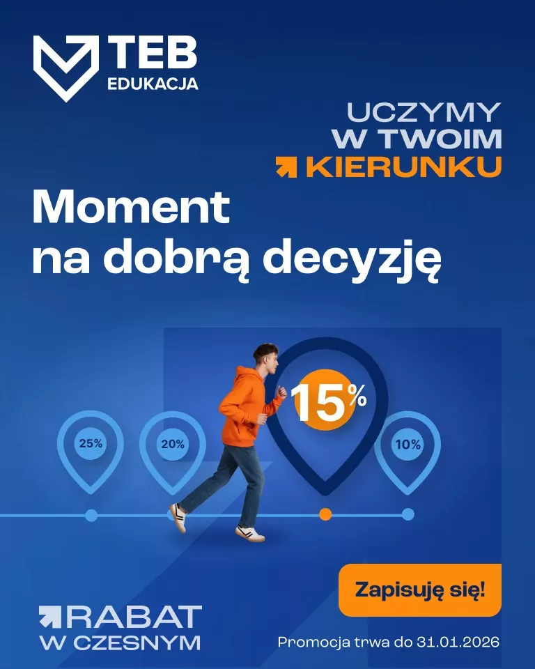 Szkoły policealne TEB Edukacja przygotowały specjalną ofertę promocyjną dla osób planujących podjęcie nauki na jednym z atrakcyjnych kierunków. Kandydaci, którzy zdecydują się na zapis w terminie do 31 stycznia, mogą liczyć na istotne obniżki czesnego w drugim semestrze nauki.